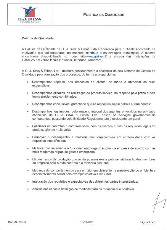 A missão da G. J. Silva & Filhos, Lda., consiste na comercialização de produtos elétricos e no fabrico de quadros elétricos. Presta assistência técnica às instalações elétricas dos seus clientes. Garante elevada capacidade de resposta como forma de se assumir como um parceiro capaz de assegurar a operacionalidade dos clientes sem perdas.