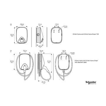 EVlink Home é um carregador que se monta na parede para todos os veículos elétricos que cumprem a IEC61851-1 O grau de proteção IP é IP55. O grau de proteção IK é IK10. A temperatura de funcionamento está entre -30°C e 50°C. O tipo de saída é um cabo anexo de 5m com uma tomada T2 na extremidade, instalado no centro inferior e superior do posto. A potência nominal de saída é de 7,4 kW. É fornecido em monofásico (1P+N). A corrente nominal de carga é de 32 A a 230 V AC com uma frequência de 50 Hz a 60 Hz. Pode ser utilizado com um sistema de ligação à terra TN-S ou TT. O posto de carregamento é fácil de instalar (não são necessárias ferramentas especiais). É recomendado para uso privado em casa, por exemplo, instalado na garagem. As dimensões são (largura) 282 mm x (altura) 409 mm x (profundidade) 148 mm. O peso do produto é de 4,5 kg. A sua cor é o branco (RAL9003). Está equipado com uma proteção integrada de corrente contínua residual (RDC-DD como dispositivo de deteção de corrente contínua residual). Não há controlo de acesso para utilizar o posto de carregamento para carregar um veículo elétrico. Um botão vermelho de pressão está presente em caso de paragem de emergência. Um LED muda de cor entre o vermelho, verde e azul para indicar o estado de carga diretamente no posto de carregamento. Ao complementar o posto de carregamento com o sistema de equilíbrio de carga residencial, beneficia de uma gestão dinâmica de energia. Isto permite ajustar em tempo real a potência máxima atribuída à carga do veículo elétrico, dependendo do consumo do resto das cargas em casa.