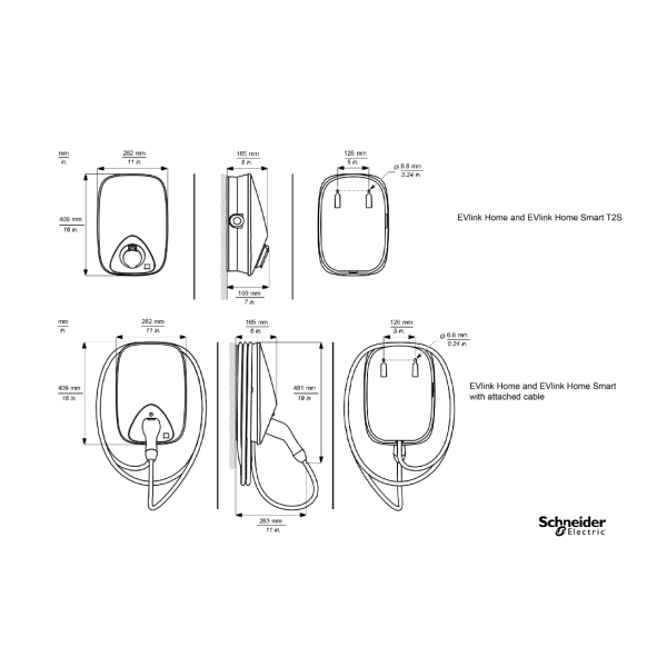 EVlink Home é um carregador que se monta na parede para todos os veículos elétricos que cumprem a IEC61851-1 O grau de proteção IP é IP55. O grau de proteção IK é IK10. A temperatura de funcionamento está entre -30°C e 50°C. O tipo de saída é um cabo anexo de 5m com uma tomada T2 na extremidade, instalado no centro inferior e superior do posto. A potência nominal de saída é de 11 kW. É fornecido em trifásico (3P+N). A corrente nominal de carga é de 16 A a 230 VAC com uma frequência de 50 Hz a 60 Hz. Pode ser utilizado com um sistema de ligação à terra TN-S ou TT. O posto de carregamento é fácil de instalar (não são necessárias ferramentas especiais). É recomendado para uso privado em casa, por exemplo, instalado na garagem. As dimensões são (largura) 282 mm x (altura) 409 mm x (profundidade) 148 mm. O peso do produto é de 4,5 kg. A sua cor é o branco (RAL9003). Está equipado com uma proteção integrada de corrente contínua residual (RDC-DD como dispositivo de deteção de corrente contínua residual). Não há controlo de acesso para utilizar o posto de carregamento para carregar um veículo elétrico. Um botão vermelho de pressão está presente em caso de paragem de emergência. Um LED muda de cor entre o vermelho, verde e azul para indicar o estado de carga diretamente no posto de carregamento. Ao complementar o posto de carregamento com o sistema de equilíbrio de carga residencial, beneficia de uma gestão dinâmica de energia. Isto permite ajustar em tempo real a potência máxima atribuída à carga do veículo elétrico, dependendo do consumo do resto das cargas em casa.